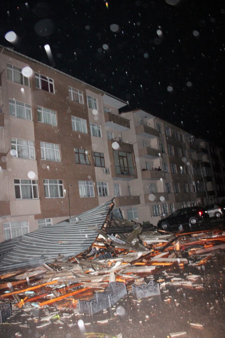 çatısı uçtu. Fırtınada uçan çatı bina önündeki bir aracın üzerine düştü. Araçta