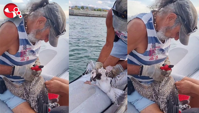Amatör kamera tarafından kaydedilen görüntülerde kurtarılan martı yeniden denizin üzerinden uçarak uzaklaştı.
