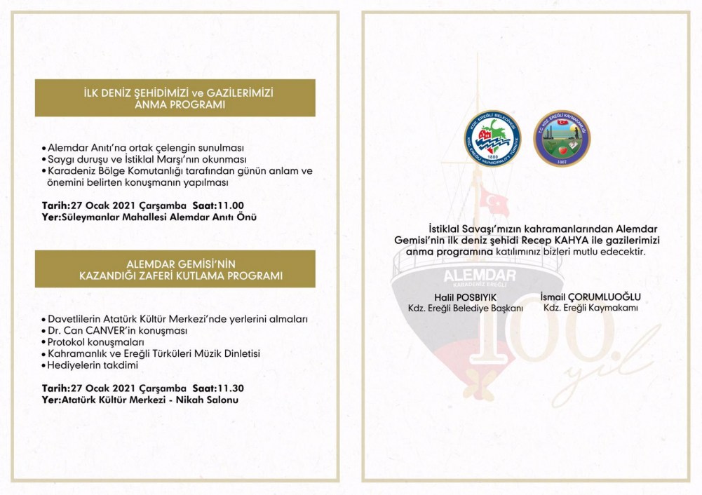Kdz. Ereğli Kaymakamlığı ve Kdz. Ereğli Belediyesi işbirliğinde Kurtuluş Savaşımızın ilk ve tek deniz zaferinin 100. Yılında Gazi Alemdar Gemisi ve kahraman mürettebatı ile ilk ve tek deniz şehidimiz Recep Kahya anılacak