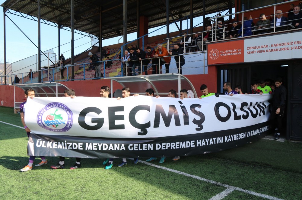 Kdz. Ereğli Belediyespor ile Akınspor ‘Dostluk’ maçında karşı karşıya geldi. İki takım futbolcu ve teknik ekibi sahaya “GEÇMİŞ OLSUN TÜRKİYEM, Ülkemizde Depremde Hayatını Kaybeden Vatandaşlarımıza Allah’tan Rahmet, Yaralılara Acil Şifalar Dileriz” pankartı ile çıktı.