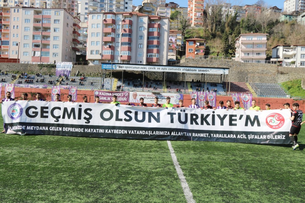İki takım futbolcu ve teknik heyetleri sahaya “GEÇMİŞ OLSUN TÜRKİYEM Ülkemizde Depremde Hayatını Kaybeden Vatandaşlarımıza Allah’tan Rahmet, Yaralılara Acil Şifalar Dileriz” pankartı ile çıktı.