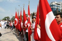 Kortejin Atatürk Anıtı önüne ulaşmasının ardından, Gençlik Hizmetleri ve Spor İlçe Müdürü Serkan Keleş Atatürk Anıtı'na çelenk sundu. Burada saygı duruşunda bulunuldu, İstiklal Marşı okundu.