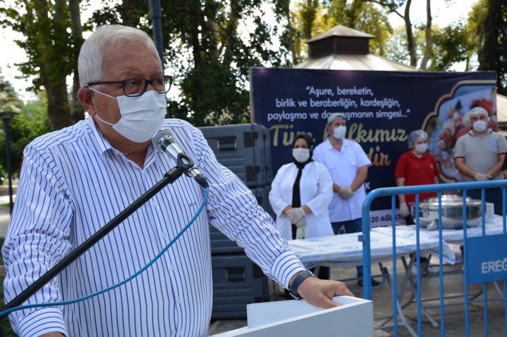 Ereğli Belediye Başkanı Halil Posbıyık, Devrim Bulvarı’ndaki Çilekli Kadın Heykeli alanındaki dağıtım öncesi yaptığı konuşmada, Muharrem Ayı dolayısıyla Belediye geleneğini sürdürdüklerini söyledi.