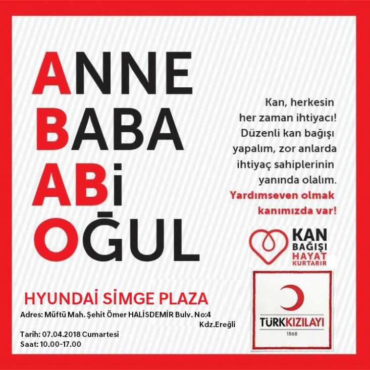 Hyundai Simge Plaza'dan konuya ilişkin yapılan açıklamada: 'ANNE BABA ABİ OĞUL ' sloganıyla 13. Geleneksel Hyundai Simge Plaza Kan Bağışı Kampanyası 07 Nisan Cumartesi günü saat 10.00-17.00saatleri arasında gerçekleştirilecek.