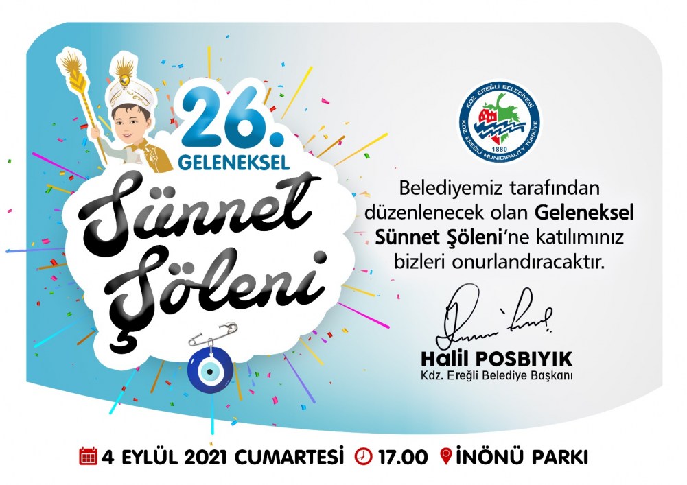 Kdz. Ereğli Belediyesi 26’ncı Geleneksel Sünnet Şöleni 4 Eylül Cumartesi Günü saat 17.00’de İnönü Park’ında yapılacak.