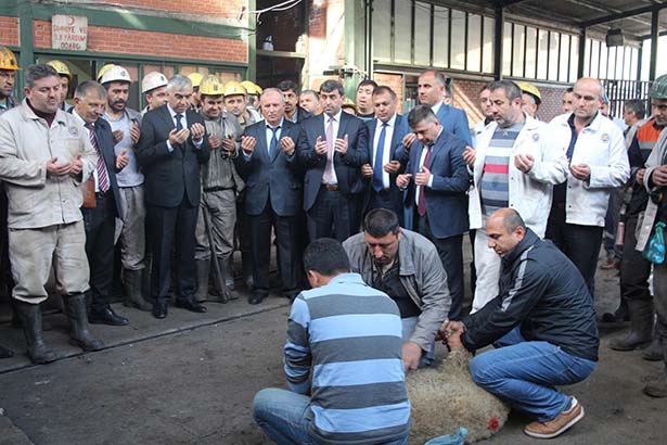 ilahiler eşliğinde kurban kesildi. Kurban kesimi ardından madenciler ocağa