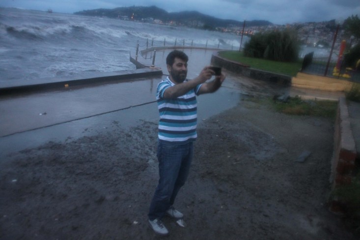 GEMİLERİ SÜRÜKLEYEN DALGALAR ÖNÜNDE SELFİE ÇEKTİ