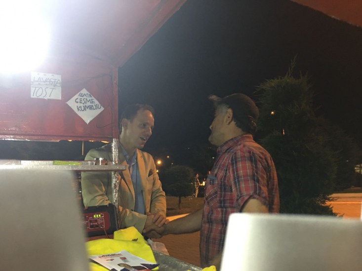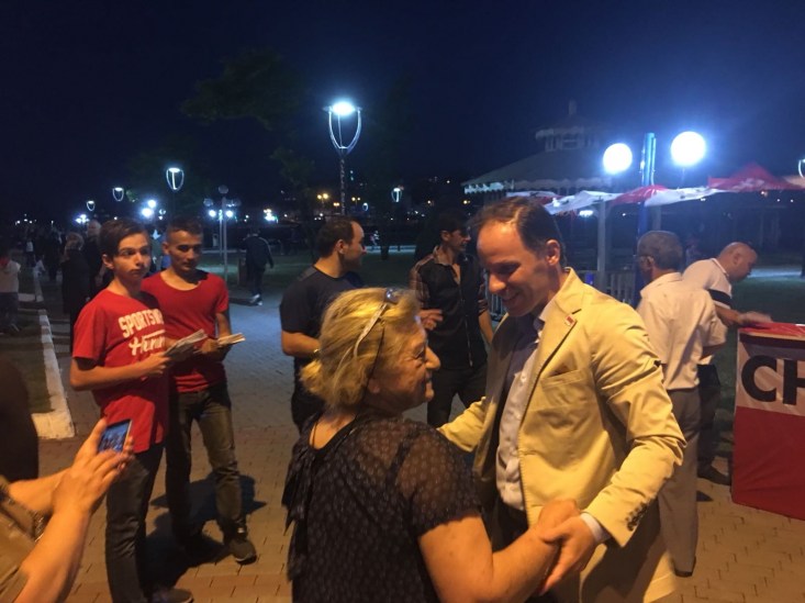 Alaplı'da Cumhuriyet Halk Partisi İlçe Örgütü tarafından kurulan partililerin seçim standını ziyaret eden genç aday Yavuzyılmaz, sahilde yürüyüş yapan ve serin havanın keyfini çıkartan vatandaşlarla sohbet ederek, Cumhuriyet Halk Partisinin seçim vaatlerini anlattı.