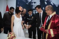 Atatürk Kültür Merkezi'nde düzenlenen nikah merasimine eski Ereğli ilçe emniyet müdürü Niyazi Koçak, Alaplı Emniyet Müdürü Erkan Tektaş, Ereğli ilçe Emniyet Amiri Nurettin Çelik, Alaplı İlçe emniyet Amiri Fatih Tosun, Alaplı ve Ereğli ilçe emniyet müdürlüğünde görevli polisler ve gençlerin aileleri katıldı. Nikah merasiminin ardından evlilik cüzdanını Emniyet Müdürü Niyazi Koçak'tan alan Elif Korkmaz, ekip arkadaşlarının koluna taktığı kelepçe ile şaşkına döndü. Diğer kelepçe de eşi Burak Korkmaz'ın takıldı. Şaşkınlıklarını gizleyemeyen genç çifte arkadaşları 'Mutluluğunuz perçinlensin, hiç ayrılmamanız için kelepçeyi taktık' diyerek genç çifti tebrik etti.