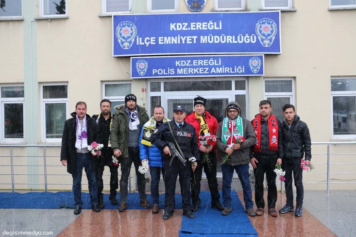 Genç Ereğlililer taraftar grubu Adem Akman ve Burhan Önder önderliğinde, İstanbul Beşiktaş'ta meydana gelen ve ülkemizi büyük bir hüzne boğan hain terör saldırısı sonucu şehit düşen polisler için İlçe Emniyet Müdürlüğünü ziyaret ederek baş sağlığı diledi. Girişte görevli polis memuru ve karakol görevlilerine karanfil veren grup, daha sonra İlçe Emniyet Müdürü Fahri Küçük'ü makamında ziyaret etti.