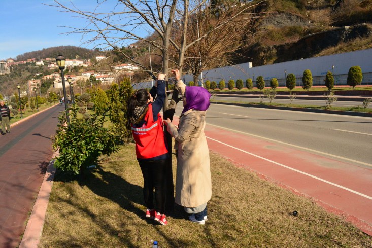 ağaçları mesken edinen kuşlar için hazırlanan kaplar sahil şeridindeki ağaçlara