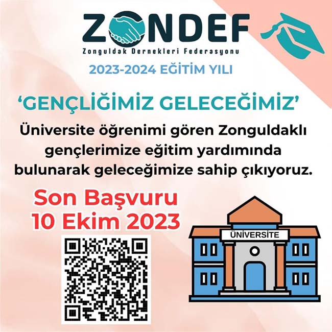 Zonguldak Dernekleri Federasyonu (ZONDEF) üniversite öğrenimi gören Zonguldaklı gençlere eğitim yardımında bulunacak. ZONDEF Genel Başkanı Ziya Öncan, hazırladıkları proje ile gençlere destek olacaklarını açıkladı. Müracaatların 10 Ekim tarihinde sona ereceğini ifade eden Öncan, "Burslarımıza Zonguldak nüfusuna kayıtlı olan, maddi desteğe ihtiyaç duyan üniversite öğrencilerimiz yararlanacak. Başvuru formumuza görselde bulunan karekodu taratarak ya da aşağıdaki bağlantı yoluyla ulaşılabilir. Başvuruların değerlendirmeye alınabilmesi için formun eksiksiz doldurulması gerekmektedir. Müracaatlar 10 Ekim 2023 Salı günü Saat: 21:00’da sona erecektir. Başvuruların tamamı akademik kurul tarafından incelenerek değerlendirilecek ve bursiyer olmaya hak kazanan öğrencilerimize bildirim yapılacak. Federasyonunuza burs desteğinde bulunmak isteyen eğitim gönüllüsü tüm dostlarımızın, hemşerilerimizin