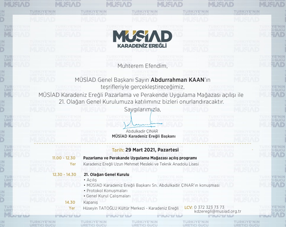 Alınan bilgiye göre, MÜSİAD Kdz.Ereğli 21.Genel Kurul ve Karadeniz Ereğli Pazarlama ve Perakende Uygulama Msğazası” açılış töreni MÜSİAD Genel Başkanı Abdurahman Kaya’nın katılımlarıyla 29 Mart Pazartesi günü yapılacak.