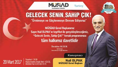 Müstakil Sanayici ve İş adamları Derneği (MÜSİAD) Karadeniz Ereğli Şubesi tarafından MÜSİAD Genel Başkan Nail Olpak'ın konuşmacı olarak katılacağı "Gelecek Senin, Sahip Çık" konulu program yapılacak.