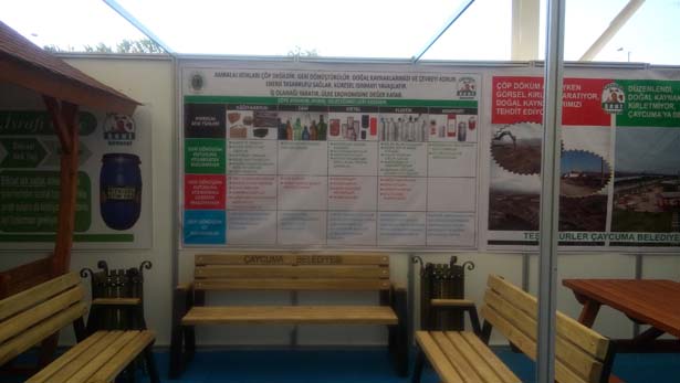 Zonguldak'ın Çaycuma ilçesinde 4.Batı Karadeniz Gıda Tarım ve Hayvancılık Fuarında ÇayBel Standında hazırlanan pankartlarla ambalaj atıklarını ayırma ve geri dönüşüme kazandırma uygulamaları stand ziyaretçilerine anlatıldı.