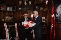 Yeni yöneticiler, görevi devraldıkları önceki yöneticileri çiçek buketi sunarak