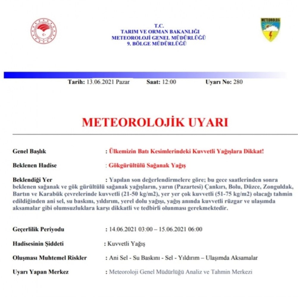 Zonguldak Valiliği 1 Haziran 2021 Pazar günü gece saatlerinden itibaren havanın gölgürültülü sağanak yağışa yönelik uyarıda bulundu.