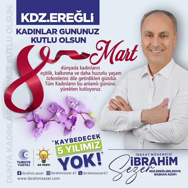 AK Parti Kdz.Ereğli Belediye Başkan Adayı İbrahim Sezer, 8 Mart Dünya Kadınlar Günü nedeniyle yayımladığı mesajında; “gönüllerde özel bir yere sahip olan kadınlarımızın 8 Mart Dünya Kadınlar Günü'nü en içten dileklerimle kutlarım.”