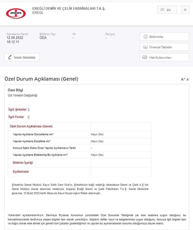 KAP’a bildirilen yazıda “Şirketimiz Genel Müdürü Sayın Salih Cem Oral'ın, Şirketimizin bağlı ortaklığı İskenderun Demir ve Çelik A.Ş.'nin Genel Müdürü olarak atanması nedeniyle, boşalan Ereğli Demir ve Çelik Fabrikaları T.A.Ş. Genel Müdürlük görevine, 12 Eylül 2022 tarihi itibarıyla Sayın Niyazi Aşkın Peker atanmıştır” ifadeleri yer aldı.