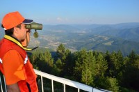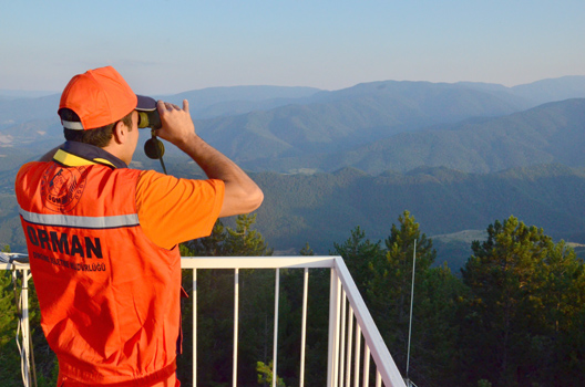 Zonguldak'ta yangınlara karşı ormanı dürbünle izleyen işçiler, olası yangın alarmına karşı telsizlerle haberleşmeyi de sağlıyor.
