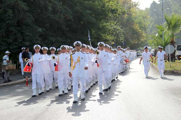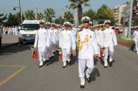 Anıtı önünde tören düzenleyen Filotilla Komodoru komutanları ve öğrencileri,