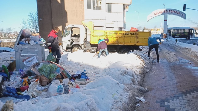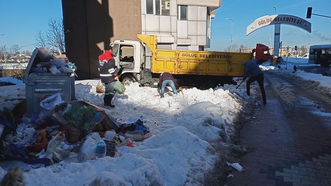 Gülüç Belediyesi yoğun kar yağışının ardından kapanan yolları açmak için sabah saatlerinde çalışmalara başladı. Kapanan yolların yanı sıra, yol açma çalışmalarında önleri kapanan ve çöp kamyonetlerinin ulaşmakta zorluk çektiği, çöp konteynırlarının da çevreleri temizlenmeye başlandı.