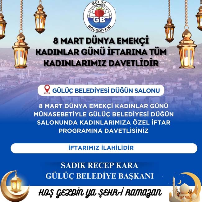 Başkan Kara, beldedeki tüm kadınların "8 Mart Dünya Emekçi Kadınlar Günü İftar Programı’na davetli olduğunu bildirerek; Gülüç Belediyesi Düğün Salonunda düzenlenecek olan iftarın musikili olacağını kaydetti.