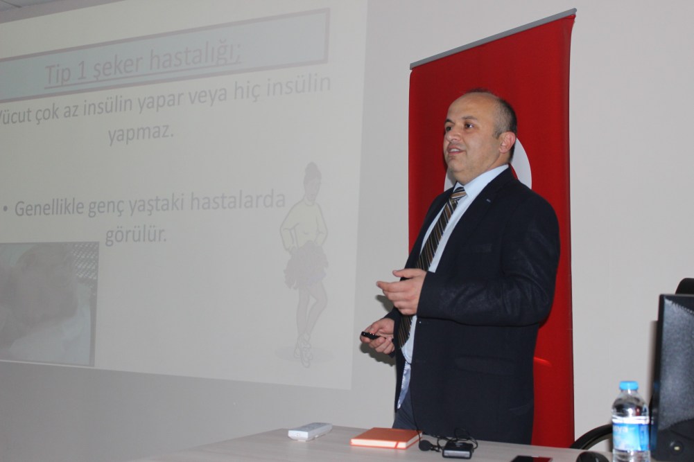 Uzm.Dr. Ertuğrul Güner, Atatürk Devlet Hastanesi Konferans salonunda sinevizyon sunumu ile vermiş olduğu konferansta, diyabetin (Şeker Hastalığı) tarihçesi, şeker hastalığı nedir, belirtileri nelerdir, Tip-1 diyabetli bireylere nasıl yaklaşmalıyız, herhangi bir koma halinde neler yapmalıyız konuları hakkında diyabetli bireyleri ailelerini ve öğretmenlerini interaktif bir şekilde bilgilendirdi. Düzenlenen sunum sonrasında katılımcıların diyabetle ilgili sorularını yanıtladı.