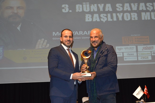 Daha sonra sahneye davet edilen Güvenlik Politikaları Uzmanı Mete Yarar da Ereğli’de bulunmaktan dolayı mutlu olduğunu söyledi ve davetlerinden dolayı MÜSİAD yöneticilerine teşekkür etti.