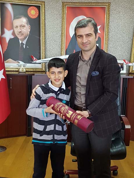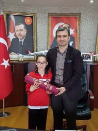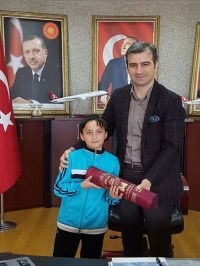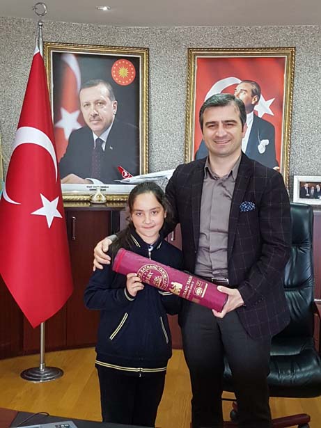 konuşmasının ardından Atatürk Ortaokulu öğrencileri Emirhan Sarıoğlu'na, Sıla