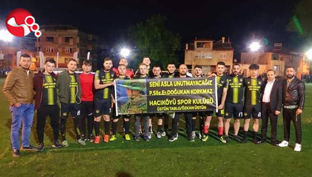 Zonguldak’ın Alaplı ilçesinde düzenlenen turnuvaya katılan Hacıköy spor, sahaya Pençe-Kilit Operasyonunda şehit düşen Doğukan Korkmaz’ın pankartı ile çıktı.