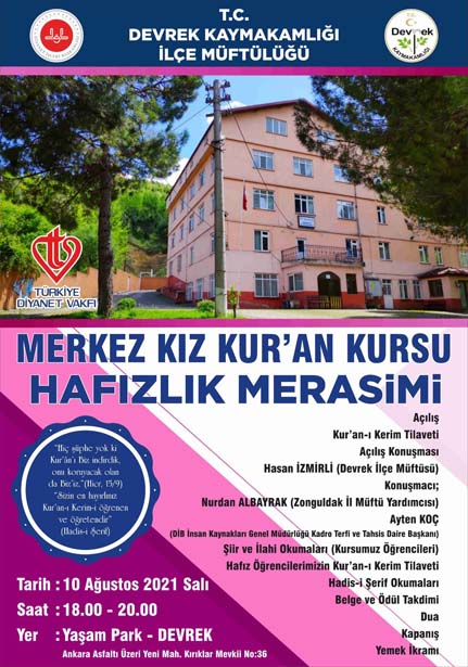 Yine aynı kurstan mezun olan kız öğrenciler için ise Hafızlık Merasimi 10 Ağustos Salı günü saat 18.00 ile 20.00 arasında Ankara yolu üzerinde bulunan Devrek Yaşam Park Bahçesinde gerçekleştirilecek.