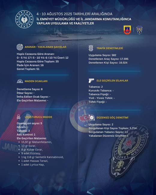 Maden ocaklarıyla ilgili yapılan denetimlerde 8 ocak denetlendi. Uyuşturucuyla mücadelede 5 operasyon düzenlendi. Operasyonlarda 3 şüpheli tutuklandı. Bir kişi ise adli kontrol şartı ile serbest bırakıldı. Operasyonda 15,97 gram metamfetamin, 10 gram esrar, 8 gram kubar esrar, 9 adet ecstasy, 1 kg 118 gram sentetik kannabinoid, 1 adet hassas terazi, 1 adet lyrica hap ele geçirildi.