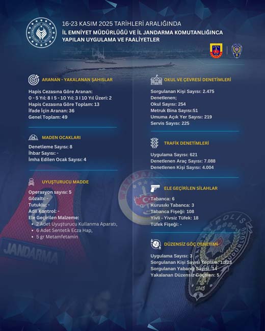 Zonguldak İl Emniyet Müdürlüğü ve İl Jandarma Komutanlığı ekiplerince 16 - 23 Kasım 2025 tarihleri arasında yürütülen asayiş ve güvenlik uygulamalarının sonuçları açıklandı.