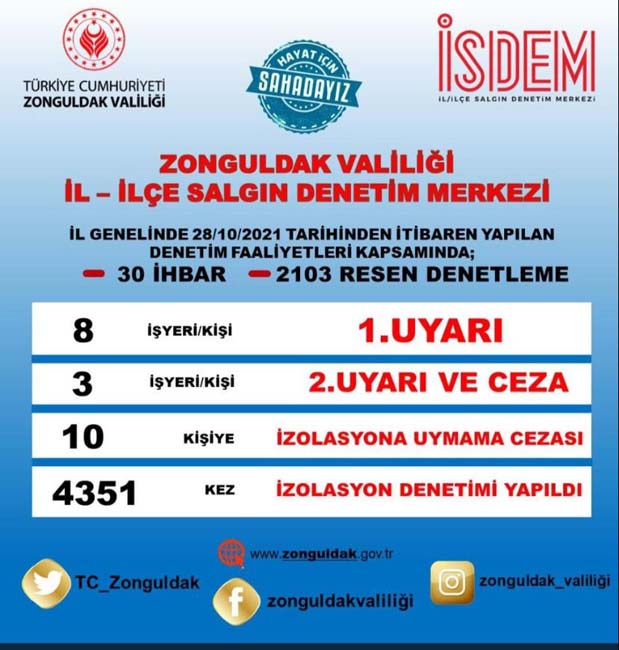 Zonguldak Valiliği İl-İlçe Salgın Denetim Merkezi haftalık korona virüs denetimlerini aralıksız sürdürüyor. Zonguldak il genelinde 28 Ekim tarihinden itibaren yapılan denetim faaliyetleri kapsamında 30 ihbar değerlendirilirken 2103 resen denetleme yapıldı.