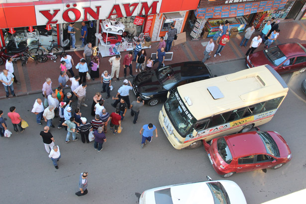 Cumhuriyet Caddesi'nde meydana gelen olayda, caddeden geçmekte olan bir dolmuş ve otomobil yol kenarlarına park etmiş araçlar yüzünden sıkışarak çarpıştı.