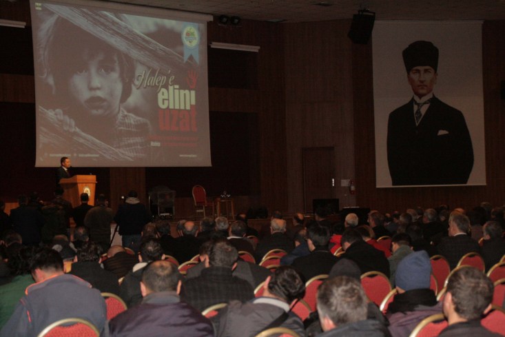 "Dünyanın neresinde olursa olsun mağdurlara yardım eden bu millettir. Müslüman kanı aktığı, Müslümanın Müslüman kanını akıttığı Suriye'de Halep, Suriye'nin ikinci büyük şehri maalesef Müslüman idareciler tarafından yakıldı yıkıldı. Türkiye Cumhuriyeti Devleti, hükümetimiz, dünyada sözünü geçirterek oradan 35-40 bin civarında Halepli kardeşimizin Türkiye'ye yakın yere gelmesini, orada barış içinde kamplarda yaşamasını sağladı. Bu insanlarımızın yardıma ihtiyacı var. Listede yazılı olan veya olmayan bütün tüketim maddelerine ihtiyacı var. Belediyemiz bu ihtiyacı göz önünde bulundurarak Ereğli halkımız olarak sizlerin yardımına ihtiyaç olduğunu ve Halep'e göndermek için gayret sarfettiğini göstermiş bulunuyor. Yardımsever milletimizin fertlerinin yaşadığı Ereğli halkımız da hiç şüphesiz böyle mağdur insanlara yardıma koşmaktadır. Geçen Cuma günü camilerimizde Halep için yardım toplandı. Bütün camilerimizde başka ihtiyaçlar için normalde 13-14 bin lira yardım toplanır. Halep denince bunun beş altı misline çıkaracak şekilde bir yardım toplanmasına vesile oldunuz. Bu gerçekten halkımız için gurur vericidir. Belediyemizin düzenlediği kampanyanın da arzu edilenin üzerinde bir netice vereceğine inancım tam. "
