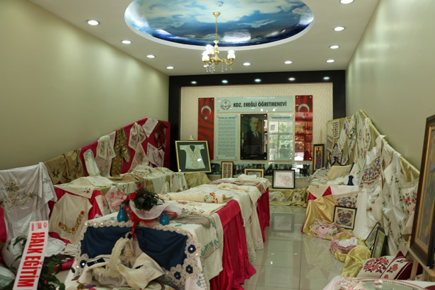 Kdz.Ereğli Öğretmenevi Lobi'de açılan ev tekstili mefruşat sergisi vatandaşların ilgi odağı oldu. Halk Eğitim Merkezi'nde açılan kurslara katılan kursiyerlerin bir yıllık emeklerini sergiledikleri
