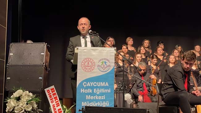 Çaycuma Kültür ve Sanat Merkezi’nde gerçekleşen konsere protokol üyeleri ve davetliler katıldı. İsmail Uzaldı’nın sunuculuğunu üstlendiği konser öncesi konuşma yapan Çaycuma Halk Eğitimi Merkezi Müdürü Gökhan İncircioğlu, halk eğitim merkezlerinin dikiş, nakıştan ibaret olmadığını belirterek, “ Yaklaşık iki ay önce eğitimi başlayan Türk Halk Müziği kursumuzun çalışmalarını taçlandıracak konserimize hoşgeldiniz. Göreve başladığımız günden itibaren açmış olduğumuz kurslarla Halk Eğitimi Merkezleri’nin dikiş ve nakıştan ibaret olmadığını göstermek için çalıştık ve çalışmaya devam ediyoruz. Bu çerçevede ilçemizde her kesime ulaşarak sosyal ve kültürel anlamındaki kurslarımızla vatandaşlarımızı buluşturuyoruz. Açılan sosyal ve kültürel anlamındaki kurslarımızı bu sene ‘Uygulamalı Tiyatro Kursumuzu’ dahil ederek tiyatro oyunumuzu üç kere siz değerli halkımıza yoğun ilgisi nedeniyle gösterime sunduk. Yine bu sene çalışmalarına başlayan Türk Halk Müziği eğitimi kursumuzla sizlerle birlikteyiz. Ben koromuzu çalıştıran başta şefimiz Mustafa Kömürcü ve değerli kursiyerlerimizi tebrik ediyorum. Kurumumuz çalışmalarında her zaman bizlere destek olan İlçe Milli Eğitim Müdürümüz İsmail Baş’a teşekkür etti.