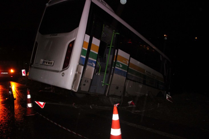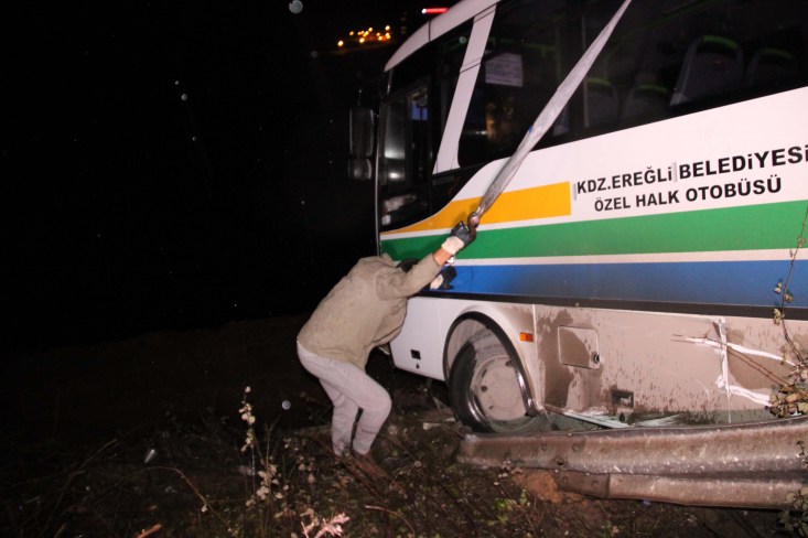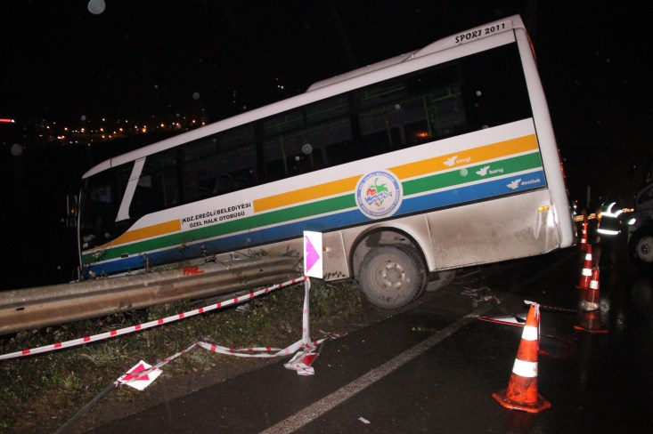 Kaza, gece saatlerinde Ömerli yol ayrımı mevkisinde meydana geldi. Ertekin Baytekin (28) idaresindeki 67 M 8030 plakalı halk otobüsü, sürücünün direksiyon hakimiyetini kaybetmesi sonucu bariyerlere çarparak uçurumun kenarında askıda kaldı. Araç içerisinde bulunan Hilal Hırçın (18) ve Ş.K. (16) yaralanırken Ertekin Baytekin ile Mustafa Dal (30) yara almadan kurtuldu. Askıda kalan halk otobüsünden çıkarılan yaralılar Ereğli Devlet Hastanesi'ne kaldırıldı. Acil serviste yapılan kontrolde sürücü Ertekin Baytekin'in 2.12 promil alkollü olduğu öğrenildi. Alınan doktor raporunun ardından otobüs sürücüsü Ertekin Baytekin ifadesi için merkez karakoluna götürüldü. Kendisine 4 bin TL para cezası kesildiği ve mahkemeye sevk edildiği öğrenildi.