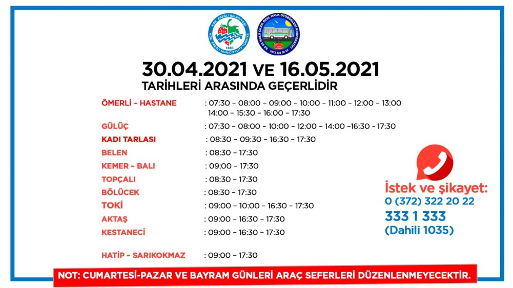 30 Nisan – 16 Mayıs tarihleri arasında Kdz. Ereğli Belediyesi Özel Halk Otobüsleri güzergah ve kalkış saatleri şu şekilde olacak: