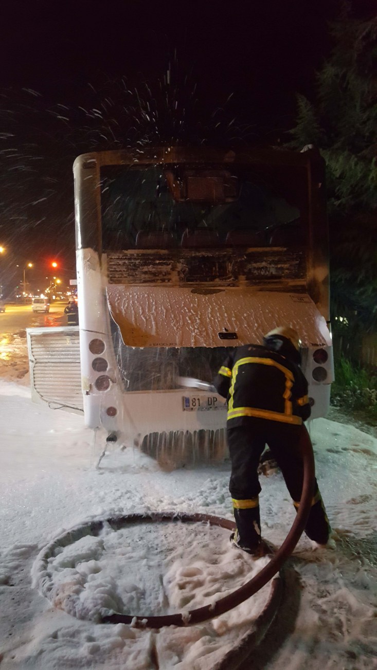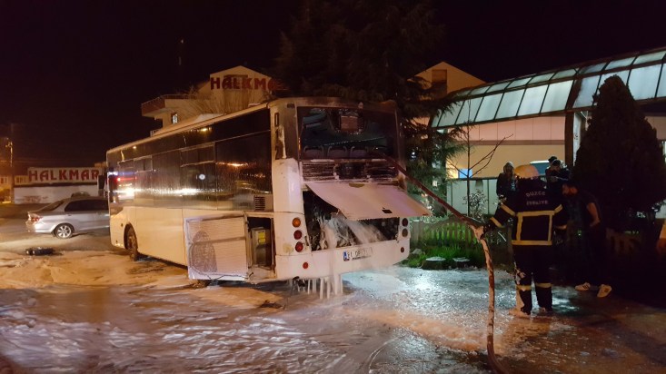Yangın saat 23.00 sıralarında Düzce Merkez Kalıcı Konutlar Bağlantı Yolu Cumhuriyet Mahallesi mevkiinde meydana geldi. Alınan bilgilere göre, şehir merkezi ile Soğancı arasında yolcu taşımacılığı yapan Hamit S. idaresinde ki 81 DP 750 plakalı Düzce Belediyesi Denetimli Özel Halk Otobüsü, seferini tamamlamasının ardından sabah yapacağı sefere hazırlanmak üzere bir benzin istasyonunun önüne çekildi. Ancak otobüsün motor kısmından aniden dumanlar yükselmeye başladı ve bir anda alevler otobüsü sardı. Vatandaşların haber vermesi ile olay yerine gelen Düzce Belediyesi İtfaiye Müdürlüğüne bağlı ekipler yaptığı müdahalenin ardından söndürülen otobüs kullanılmaz hale geldi. Yangında büyük maddi hasar meydana gelirken olayla ilgili olarak inceleme başlatıldı.