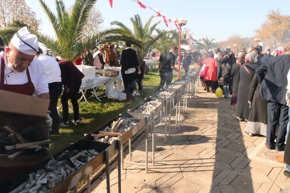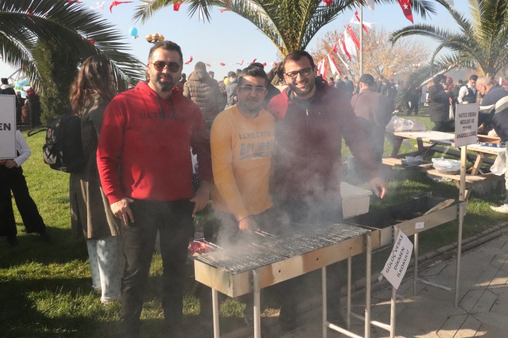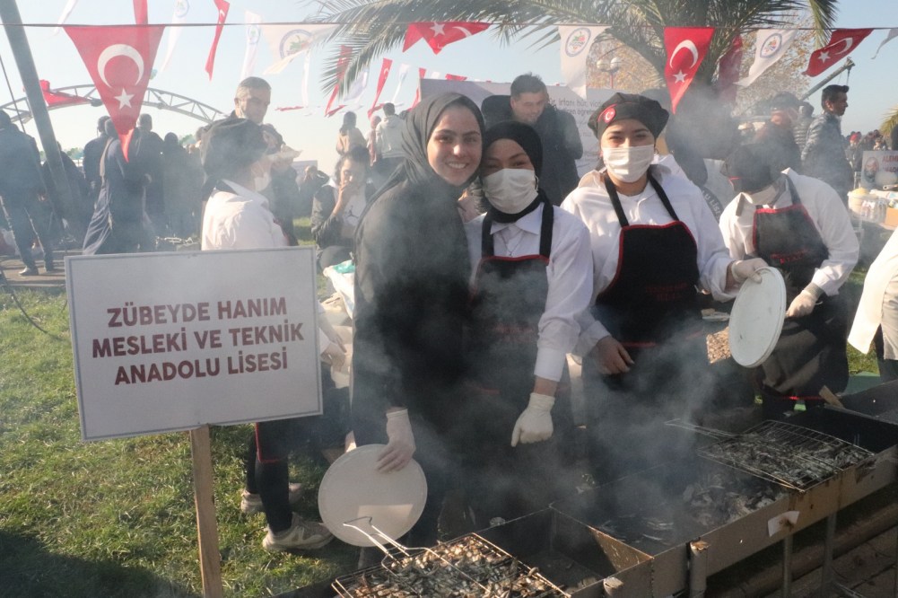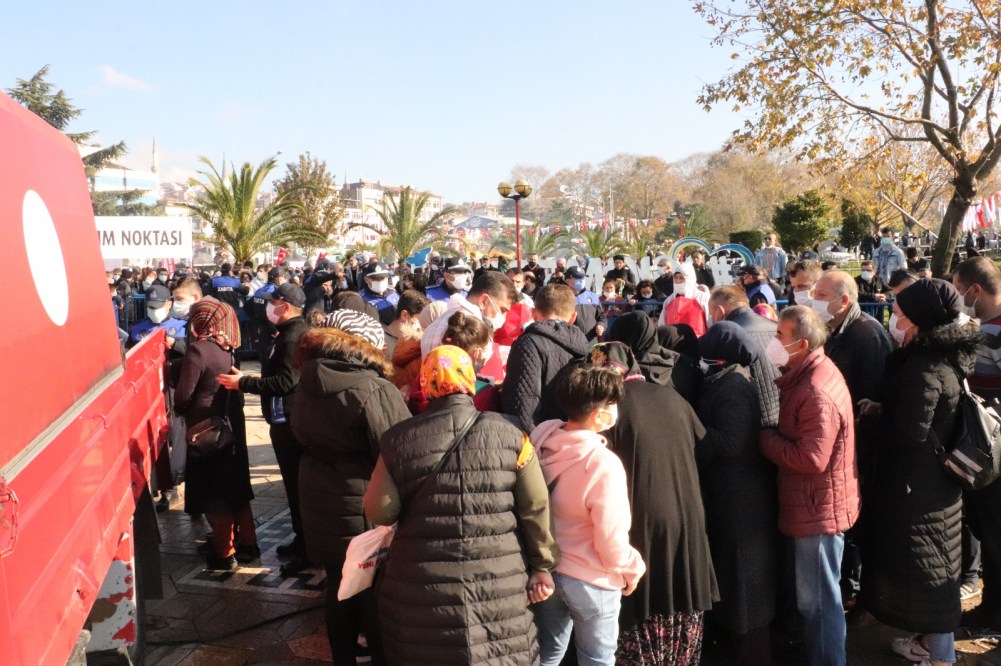 Aynı zamanda bugün bir havuz hazırladık. Havuza da 3 ton hamsi balığı yığdık. Evine hamsi götürmek isteyenlere torbalarla hamsi dağıttık. Uzun kuyruklar oluştu, dikkatinizi çekmiştir. Türkiye’nin, bölgenin dört bir tarafından insanlar buraya geldiler. Dernekler hep burada, büyük bir kalabalık var. Allah yardım etti, dün ve önceki gün hava çok kötü olmasına rağmen bugün çok güzel bir hava var.