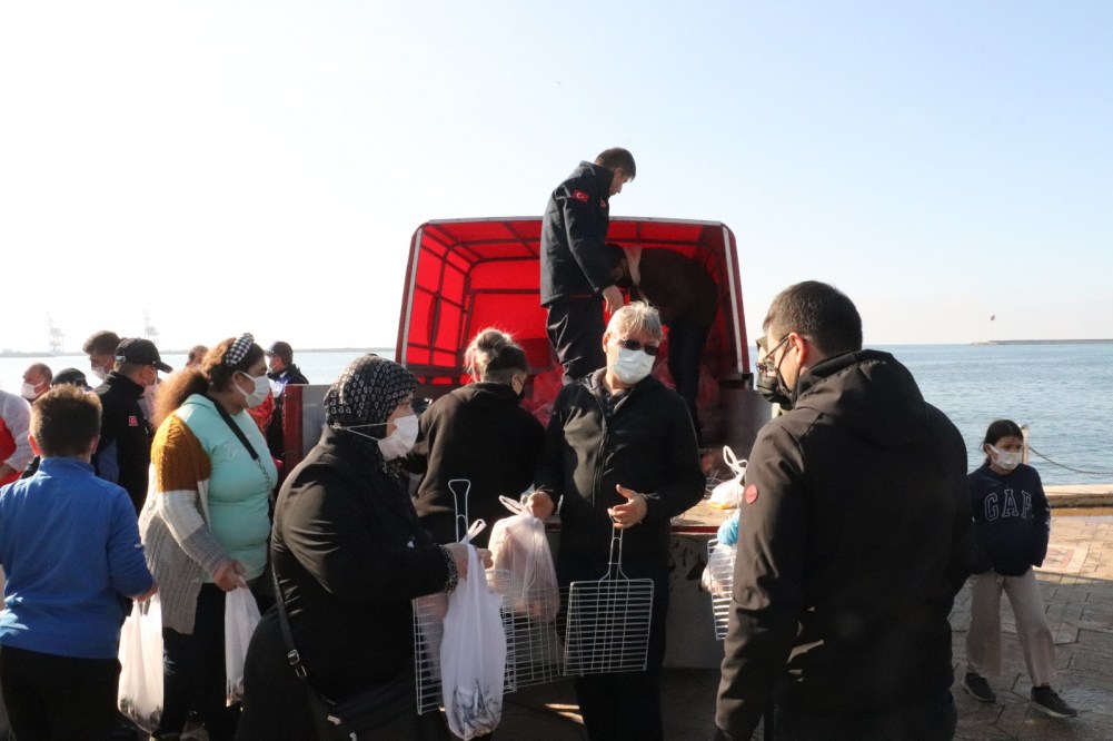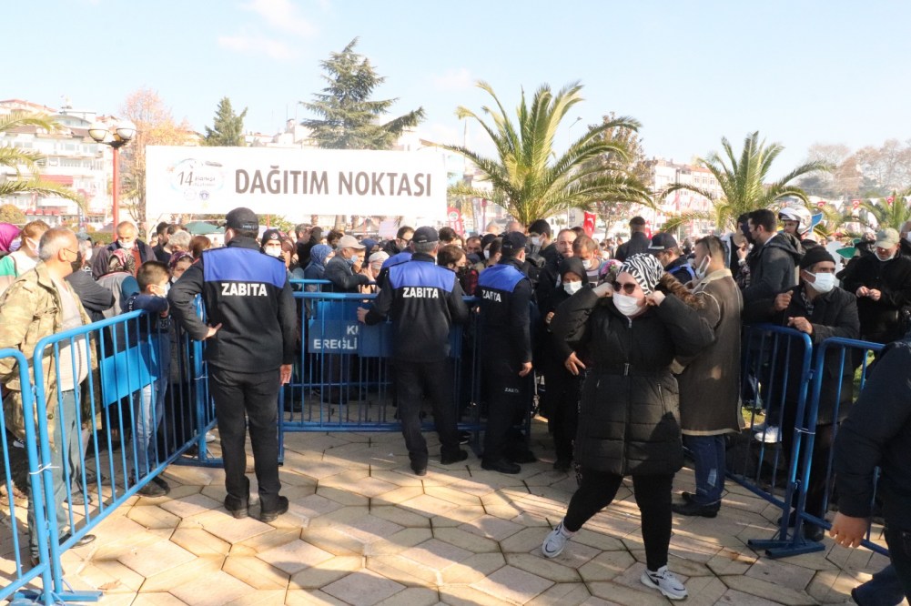 Ereğli Belediyesi’ne ait araç üzerinden yapılacak dağıtım işlemi için oluşturulan dağıtım noktası önünde önünden başlayarak oluşan kuyruk yüzlerce metreye ulaştı. Belediye Başkanı Halil Posbıyık saat 13.00’te hamsi dağıtım alanına gelerek vatandaşlara hamsi dağıttı.