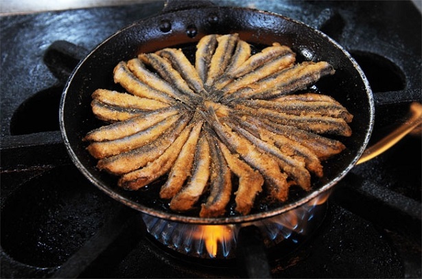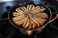 - Çok geniş olmayan balık tavasına yarım çay bardağını geçecek kadar ayçiçek yağı dökülüyor. Yağ kızdıktan sonra ocağın altını kapatıp hamsileri tavaya kuyrukları ortada kalacak şekilde diziliyor. Bu dizilişte hamsilerin birbirine değerek sıkışması gerekiyor. Daha sonra ocağın altını yeniden yakılarak hamsiler pişiriliyor. Eğer hamsileri dizerken bir yandan da ocağın altı açık kalırsa ilk dizdikleriniz pişecek, son olarak tavaya koyduklarınız ise çiğ kalacaktır. Bu nedenle ocağın altının kapalı olması gerekiyor.
