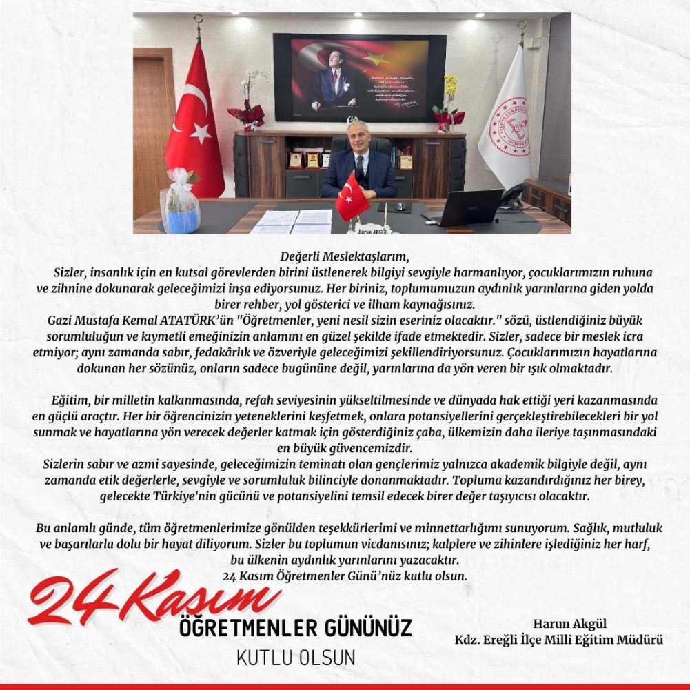 Kdz.Ereğli İlçe Milli Eğitim Müdürü Harun Akgül, 24 Kasım Öğretmenler Günü'nü kutladı.