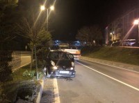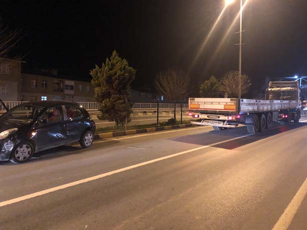 Zonguldak Alaplı ilçesinde hatalı sollama yaptığı ileri sürülen tır otomobile çarptı. Refüje çıkan otomobildeki sürücü kazayı yara almadan atlattı.