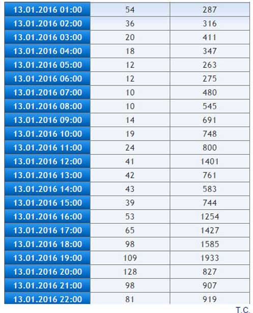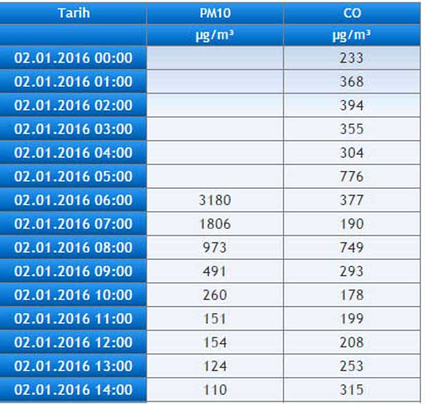 13 Ocak 2016 tarihli verilerde, Saat 20.00'de yapılan ölçümde Partikül Madde miktarının metreküp başına 128 mikrograma kadar yükseldiği gözleniyor. Karbonmonoksit miktarının ise aynı gün saat 19.00'da 1933 mikrogramla zirve yaptığı ölçümü yapılmış.