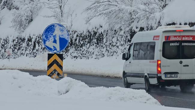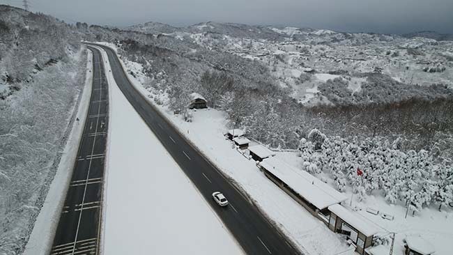 Zonguldak'ta etkili olan yoğun kar yağışı yerini sakin bir havaya bıraktı. Kenti Ereğli ilçesine bağlayan kara yolunda Karayolları ekiplerinin yürüttüğü yoğun kar küreme ve tuzlama çalışmalarıyla yol tamamen ulaşıma açıldı. Asfalt zeminin karla kaplı ormanların arasından süzüldüğü güzergah, dron ile görüntülendi. Hava sıcaklığının 1 derece olarak ölçüldüğü bölgede, sürücüler, iki tarafı karla kaplı ağaçlarla çevrili yolda ilerlerken oluşan manzara eşliğinde yolculuklarını sürdürdü. Ulaşımda herhangi bir aksamanın yaşanmadığı yolda, kar manzarası havadan estetik görüntüler oluşturdu.