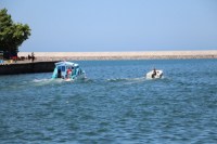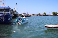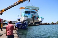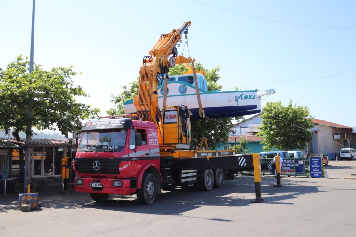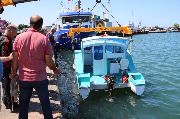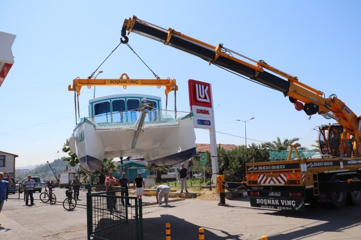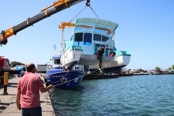 Öğlen saatlerinde vinç ile suya indirilen teknenin törenine